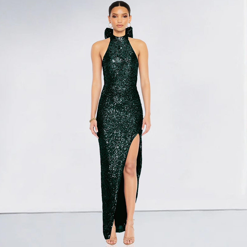 Elegant Luxury Sequin Halter Big Bow Backless Long Dresses Women Sleeveless High Split Birthday Evening Wedding Vestidos