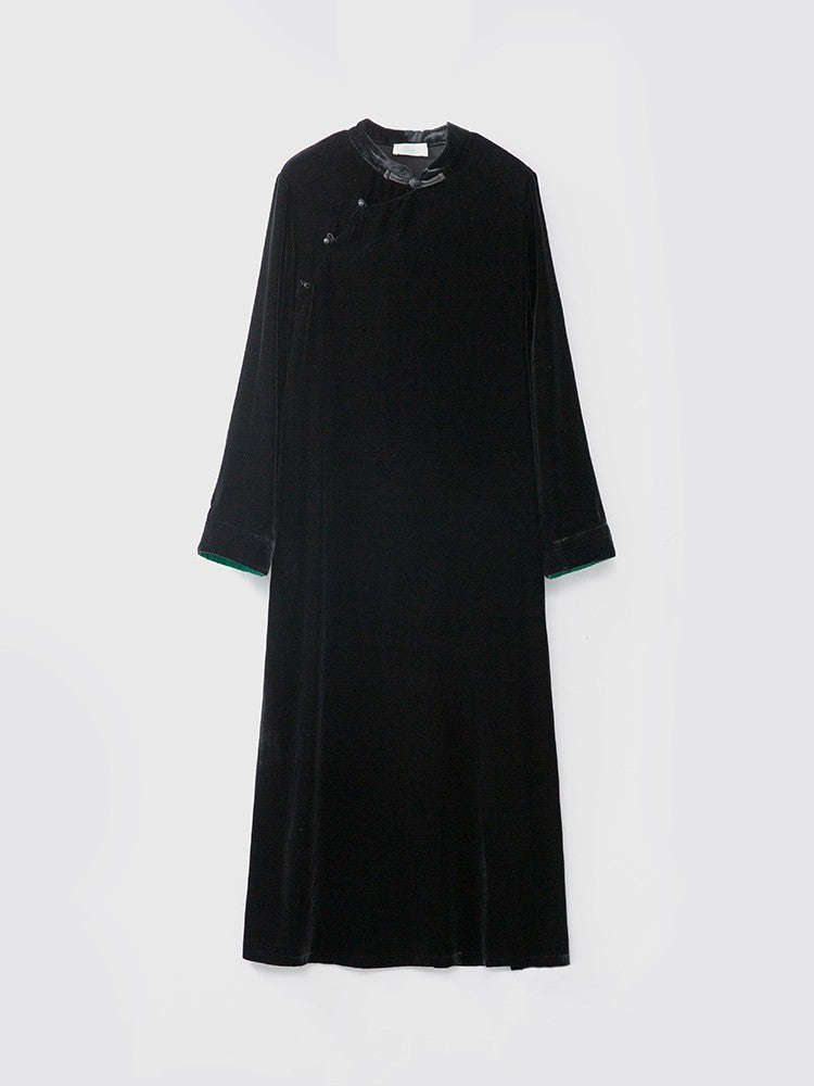 High Quality National Style New Chinese Improved Mandarin Collar Dress Female Silk Velvet Temperament Color Contrast Patchwork